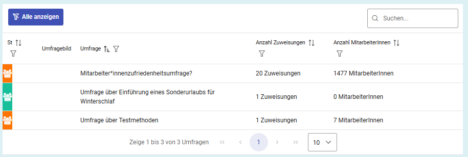 In der Umfragenliste können wie gewohnt über die Suche einzelne Suchbegriffe gesucht werden, die Ergebnisse nach unterschiedlichen Kriterien gefiltert und sortiert werden, sowie mit dem Button ‘Alles anzeigen’ alle Filtereinstellungen gelöscht werden.