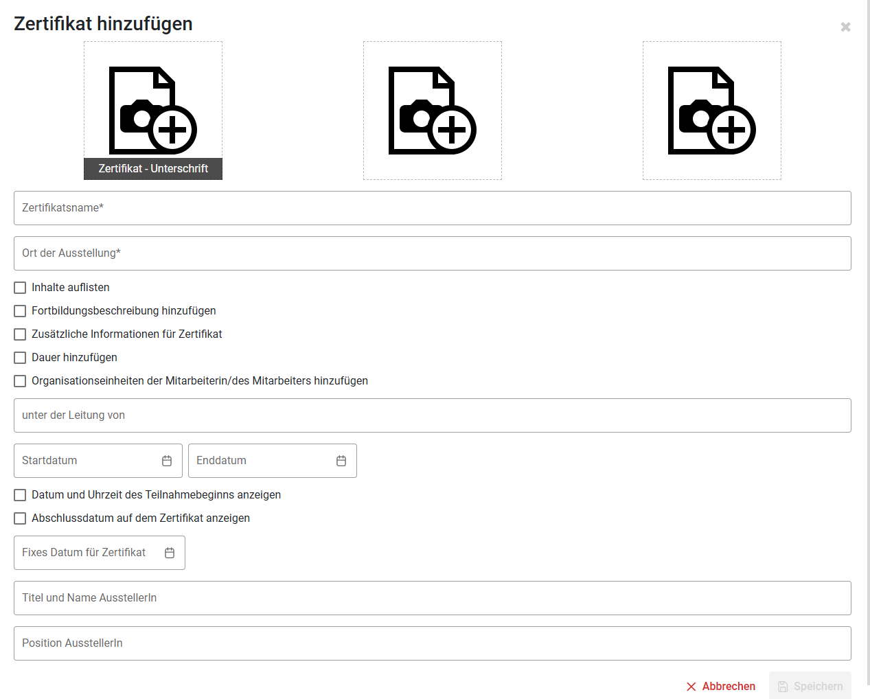 Zum Schluss können Sie den Namen der Kurs-Leitung angeben. Auch der Titel, Name und Position des Zertifikats-Ausstellers können angegeben werden, sowie das Abschlussdatum.