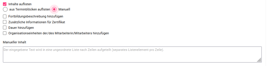 Hier können automatisch die Inhalte der Kapitel aufgeführt (oder bei Seminaren die Inhalte der Terminblöcke) oder manuell Inhalte eingetragen werden. Das ist besonders für umfangreiche Fortbildungen sinnvoll.