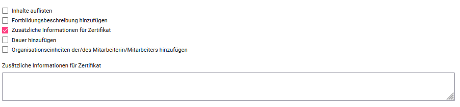 Wenn Sie zusätzliche Informationen aufführen möchten, können Sie diesen Punkt auswählen. Es öffnet sich unter den Optionen ein freies Textfeld. Hier können Sie bspw. Hinweise zur Anrechenbarkeit des Zertifikates hinterlegen.