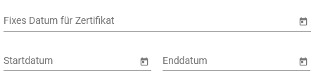 Sie können auswählen ob das Zertifikat ein fixes Datum für die Ausstellung hat oder für mehrtägige Veranstaltung einen Zeitraum angeben. Bitte beachten Sie, dass Sie ein Start- und Enddatum eingeben und das Enddatum nach dem Startdatum liegen muss.